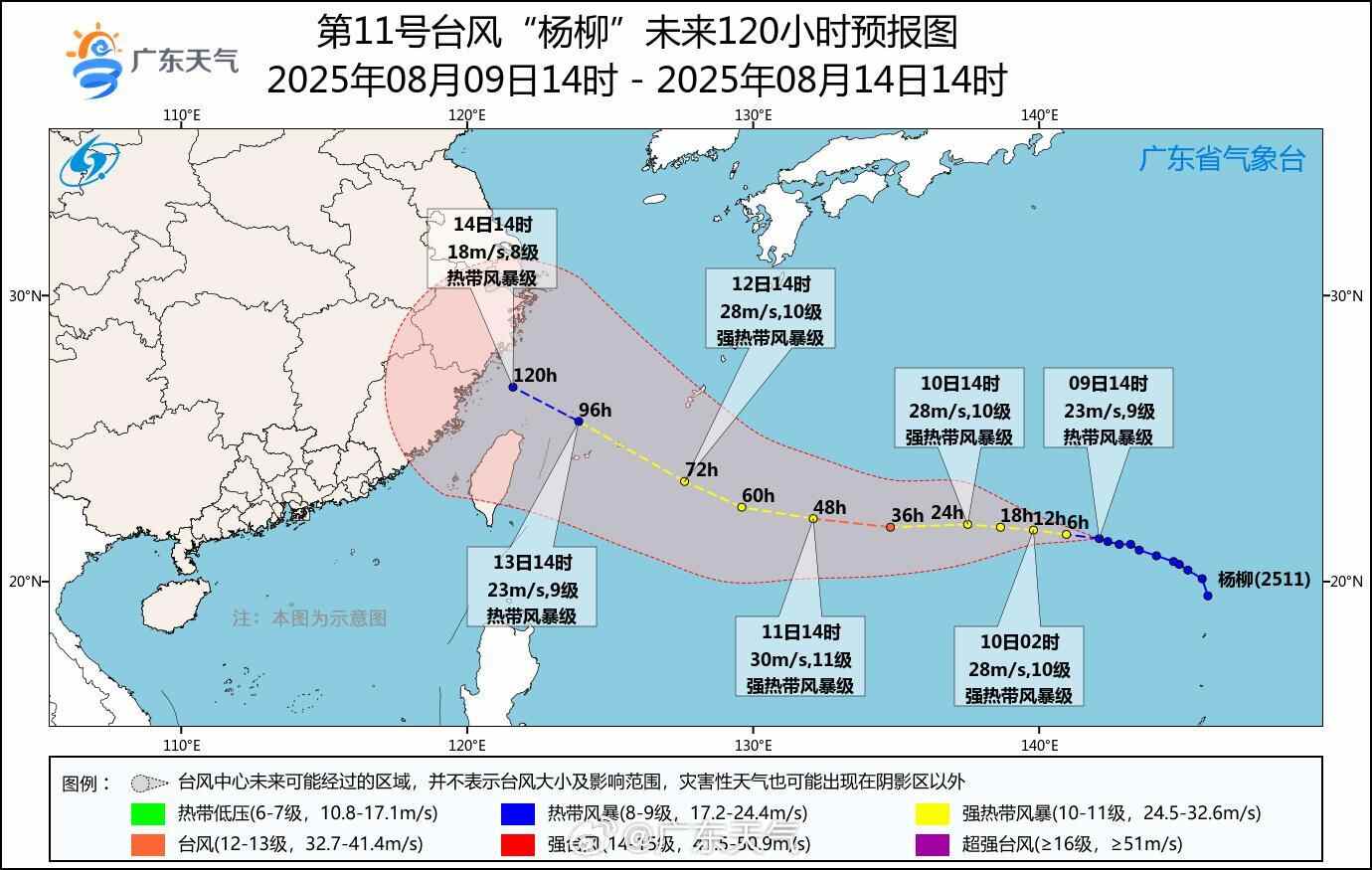 8月9日14时,今年第11号台风“杨柳”中心位于台湾省台北市东偏南方向约2100公里的洋面上,中心附近最大风力9级(23米/秒),中心最低气压990百帕。预计,“杨柳”将以每小时15-20公里的速度向西偏北方向移动,强度变化不大,逐渐向台湾以东洋面靠近。未来五天对广东省陆地和海洋无直接影响。
