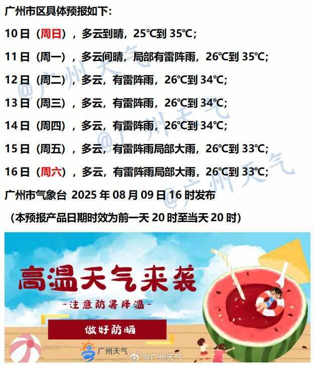 @广东天气 预计,10-12日广东省以高温和分散雷雨天气为主。虽然本轮强降水已结束,但强降水诱发的地质灾害有滞后性,仍需做好监测和防御工作;天气转高温炎热,注意防暑降温。
