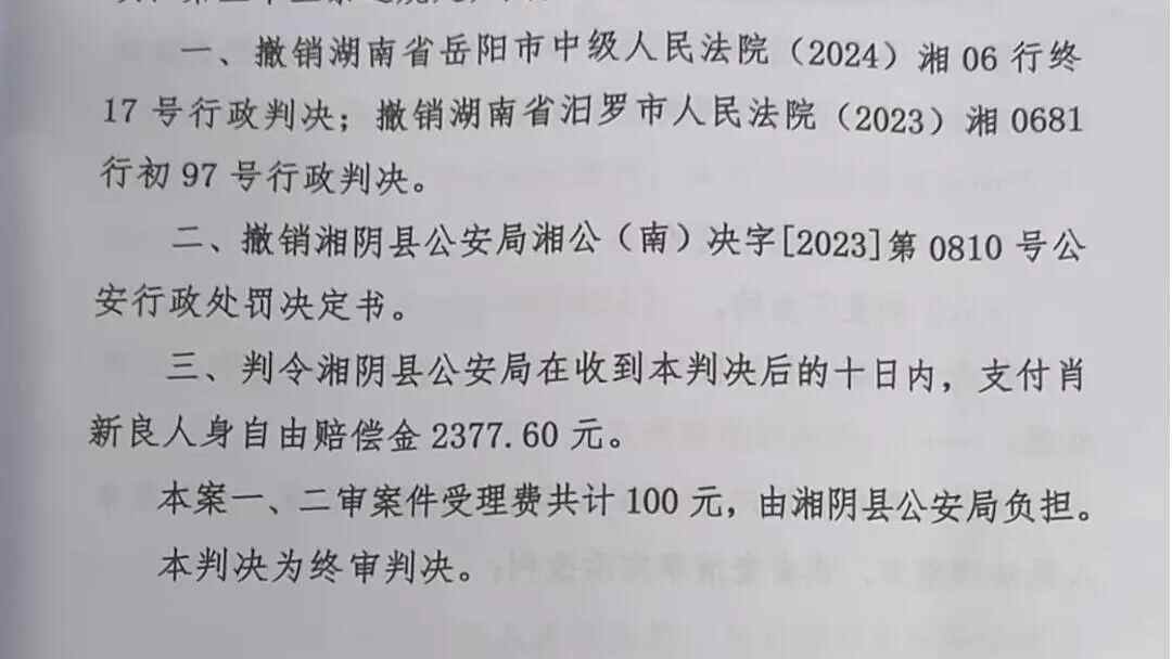 2025年6月25日,49岁的湖南湘阴人肖新良拿到了一份期待已久的判决,这份判决撤销了他曾接受的行政拘留处罚。