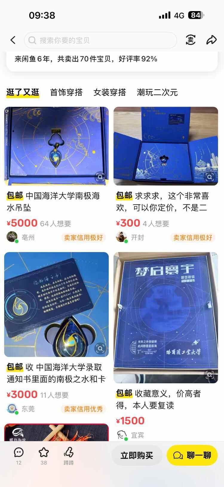 该二手平台上有人标价5000元出售南极海水吊坠,卖家称:“只出吊坠,不出录取通知书和礼盒。”记者以买家的身份联系该卖家,对方先表示“不卖,要留作纪念”,随后又表示“你打算出多少钱买,我看合适就卖”。该卖家透露,有人出价1750元他没卖,最后该卖家给记者开出了“最低2500元”的价格。记者看到,该商品页面显示“65人想要”,“4435人浏览”。