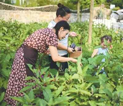 四川绵阳市青松村桂家湾乡村印象农旅基地内,菜园绿意盎然。茄子油亮、辣椒鲜嫩、黄瓜翠绿,各种应季蔬菜令人目不暇接。
