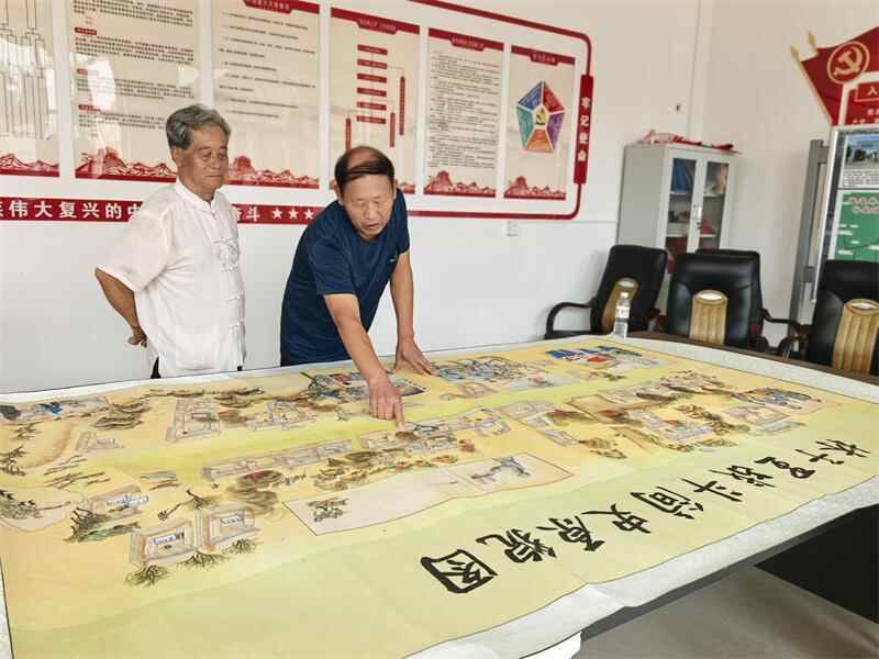 流淌在军民之间的深厚情谊,已融入村庄的血脉。李会明老人在儿子李景强的帮助下,把家里珍藏多年的一幅画抱来。这是长3米宽2米的农民画《林子里战斗简史原貌图》,生动还原了林子里村战斗的经过,清晰地标注着当年的村庄布局和风貌。