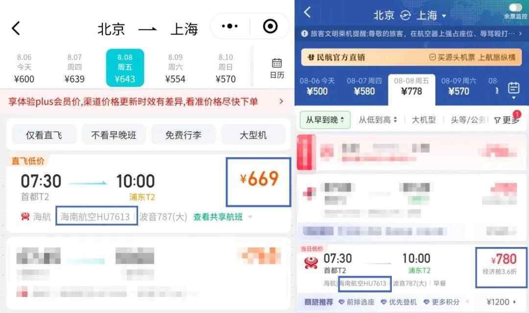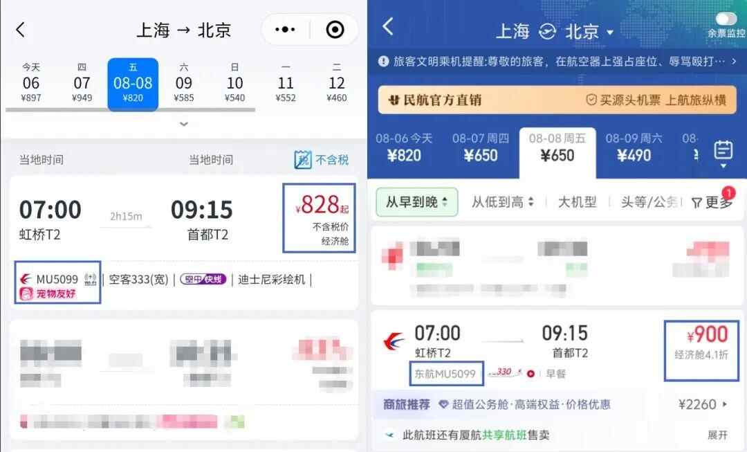 以8月8日MU5099航班(上海—北京)为例,航旅纵横上的票价为900元/张;而在东航的官方小程序上,该航班的机票最低为828元/张,属于身份认证产品。