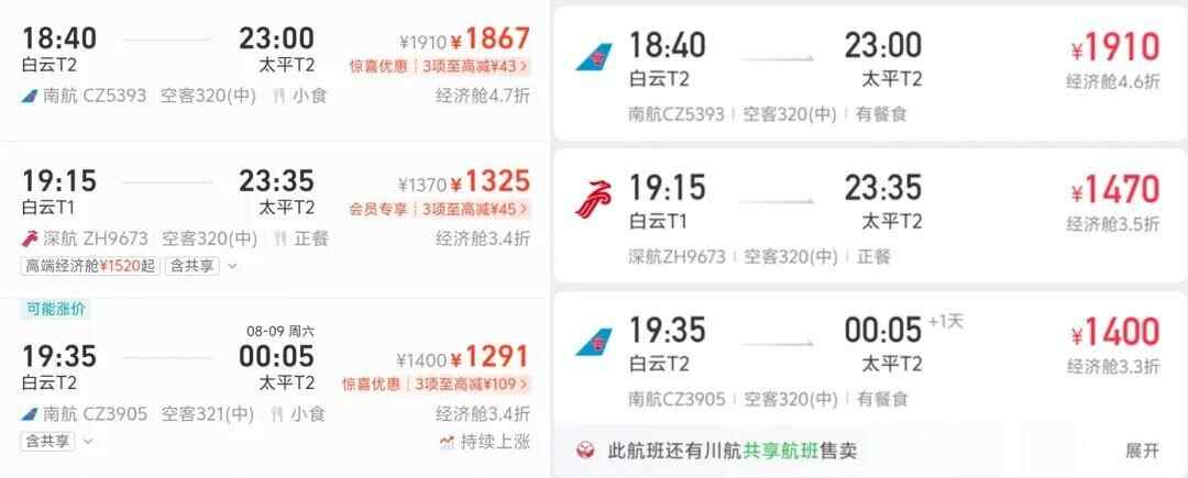 再看8月8日广州飞哈尔滨的航线,如CA3615、HU7209、ZH9671等航班,航旅纵横上的票价基本上都高于飞猪平台上的票价,每张机票高出38元到145元不等。