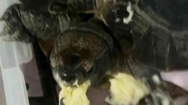 女子给乌龟尝试榴莲:小龟被熏到闭眼,大龟暴风吸入