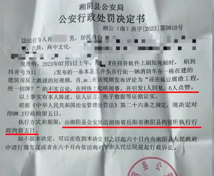 一段30秒视频的跟帖,甚至都文不对题:本来是消防救援,只是因为彼时当地部分街区正在进行集中整治改造,当事人一句“还在搞豆腐渣工程,统一招牌?”的跟帖,两天后为其带来行政拘留5日的治安处罚。