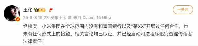 8月8日,针对网传“雷军通过富国银行茅XX向海外转出50亿美金”,小米集团公关部总经理王化发文辟谣称,经核实,小米集团在全球范围内没有和富国银行以及“茅XX”开展过任何合作,也未有任何形式上的接触。相关言论均已取证,并已经启动司法程序追究造谣传谣者法律责任。
