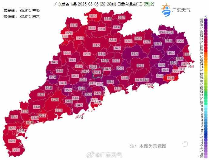 广东雨过天晴后,气温飙升。昨天,广东最高气温的地方出现在丰顺,气温高达36.9℃。截至8日17时13分,全省共有82个高温黄色预警生效。