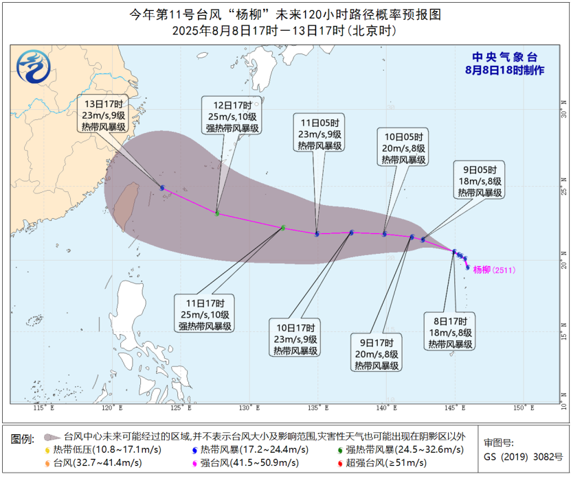 再来看看台风的动态。今年第11号台风“杨柳”于8日早晨在西北太平洋洋面上生成。预计,“杨柳”将以每小时20~25公里的速度向西偏北方向移动,强度缓慢加强,并向台湾以东洋面靠近,未来5天对广东陆地和海洋无直接影响。