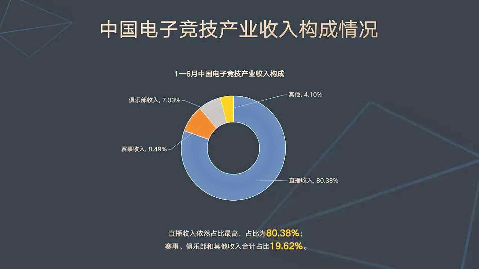 截至今年6月,电竞产业的收入中,直播收入依然占比最高,为80.38%;赛事、俱乐部和其他收入合计占比19.62%,收入结构相对稳定。