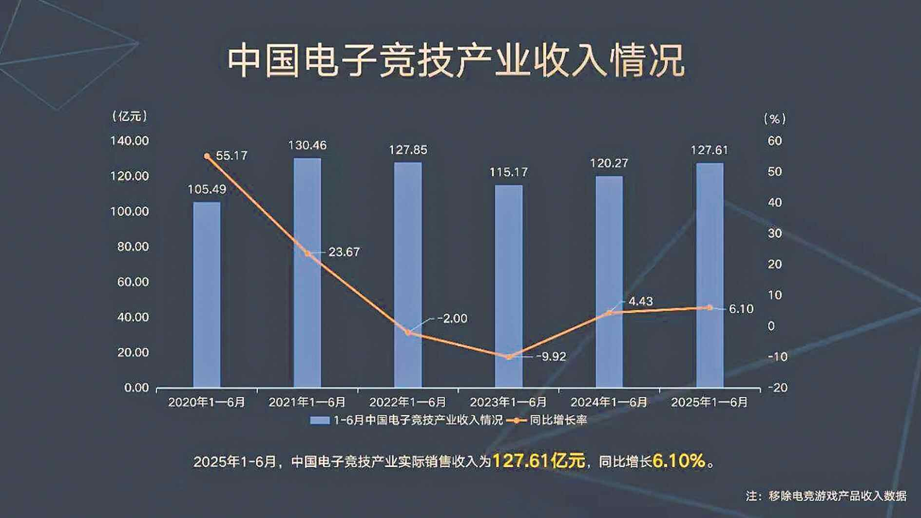2025年1-6月,中国电子竞技产业收入127.61亿元,同比增长6.10%。