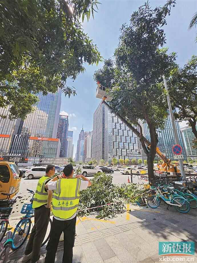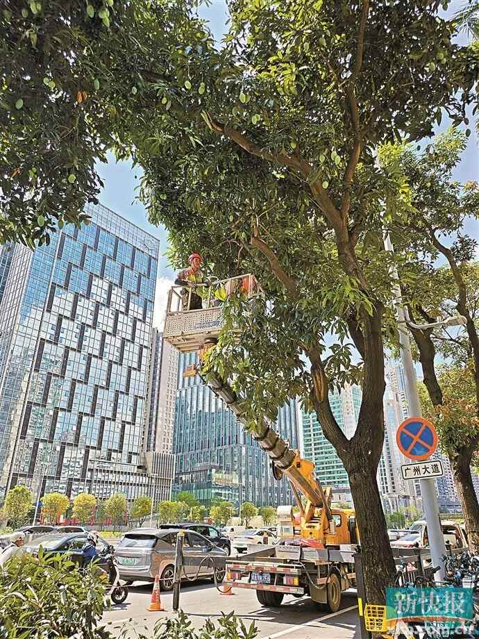 近日,新快报记者走访广州大道中,只见道路两侧的芒果树枝繁叶茂,绿色的果实挂满枝头。道路附近进行了围蔽,几名工作人员正站在吊车的操作平台上,手持专业工具修剪枝条。随着工作推进,一串串大芒果失去支撑,“噗通噗通”从枝头坠落,落满一地。
