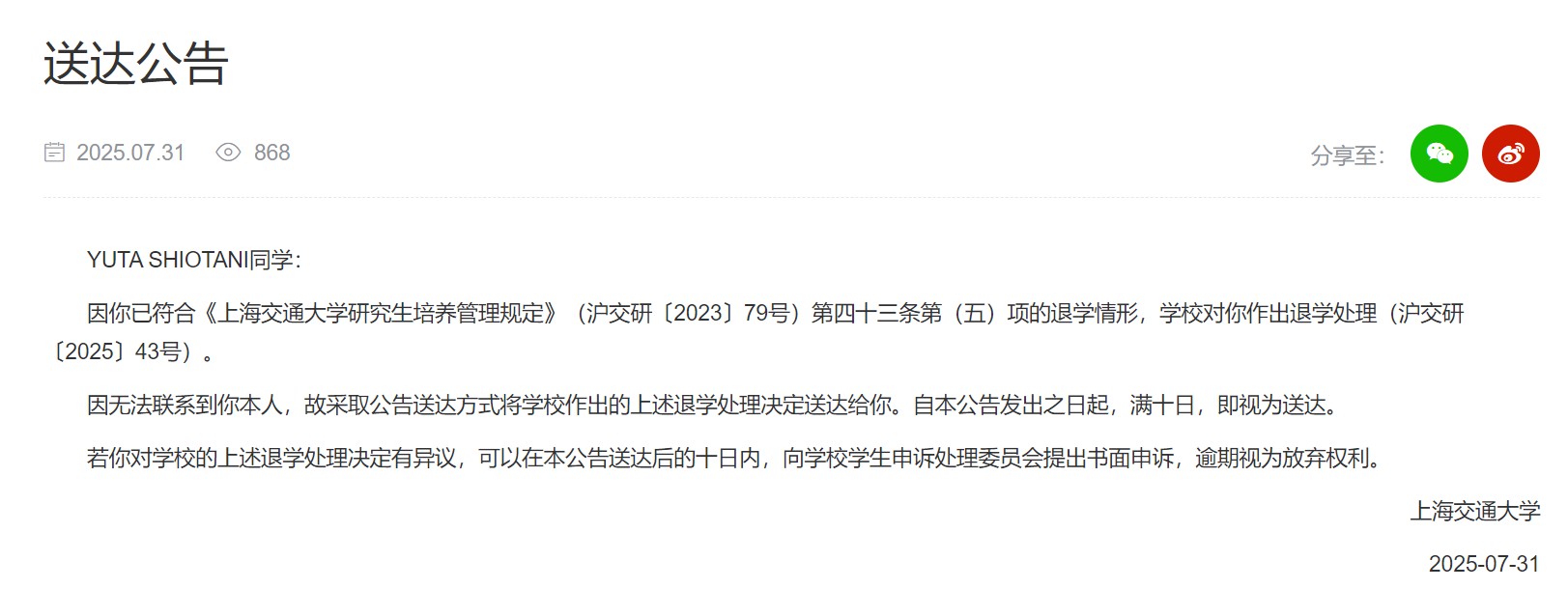 六条送达公告均载明,“因你已符合《上海交通大学研究生培养管理规定》(沪交研〔2023〕79号)第四十三条第(五)项的退学情形,学校对你作出退学处理。因无法联系到你本人,故采取公告送达方式将学校作出的上述退学处理决定送达给你。自本公告发出之日起,满十日,即视为送达。若你对学校的上述退学处理决定有异议,可以在本公告送达后的十日内,向学校学生申诉处理委员会提出书面申诉,逾期视为放弃权利。”