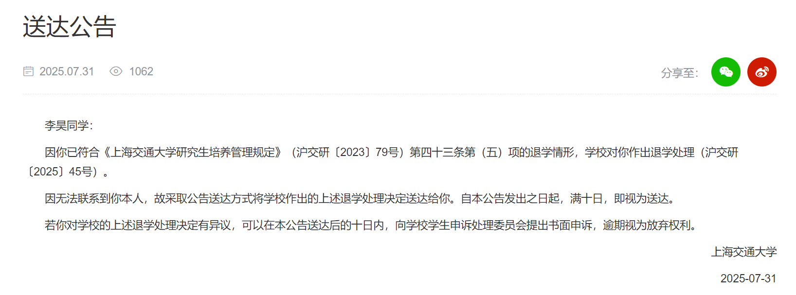 8月2日,记者从上海交通大学研究生院官网获悉,7月31日,该校发布6条送达公告,对李某等6位同学作出退学处理。