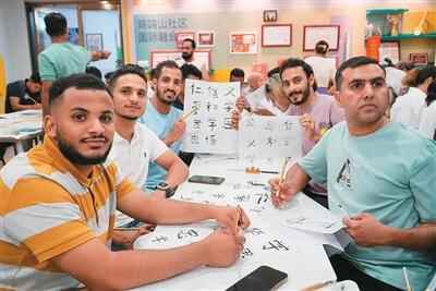 外籍居民在社区汉语班上展示书法作品。