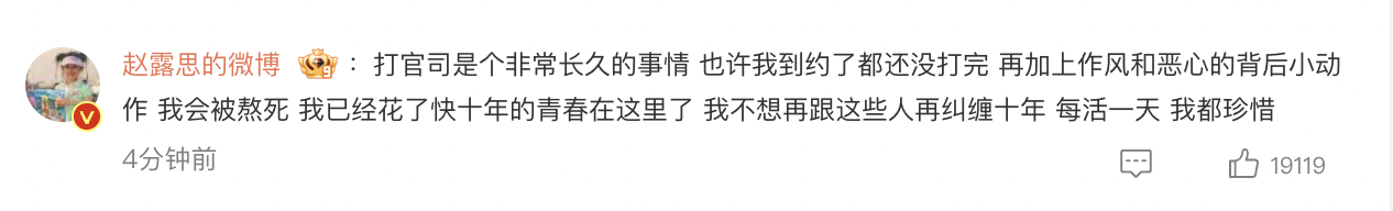 随后,赵露思转发经纪公司原文,内涵经纪公司“绿茶”并接连评论。她认为公司并未联系她本人,并且不会解决她发文中提到的问题。她还表示经纪公司在业内到处说她装病,自己不想再和公司纠缠十年。