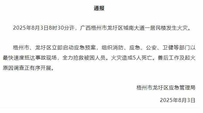 记者从广西梧州市龙圩区应急管理局了解到,8月3日8时30分许,梧州市龙圩区城南大道一居民楼发生火灾,造成5人死亡。