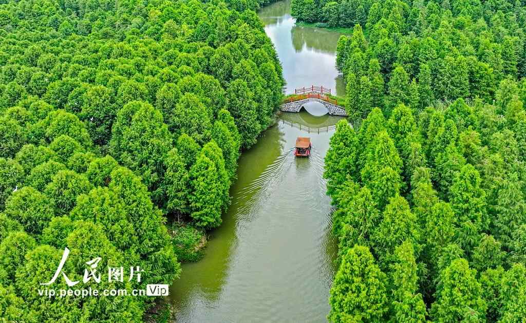 8月2日,江苏省宿迁市宿豫区新庄镇杉荷园湿地,郁郁葱葱的水杉树与清澈碧绿的河水相互映衬,构成一幅动人的“杉”水画卷。陈红摄(人民图片网)
