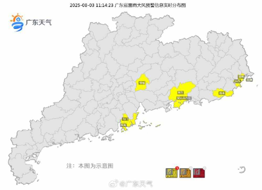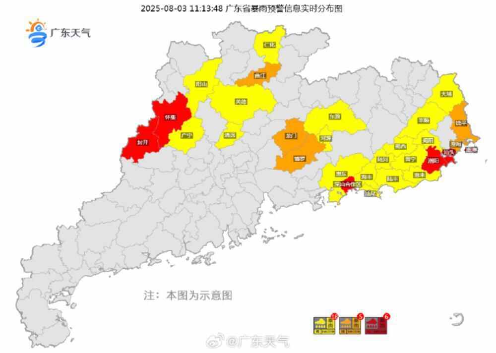 截至8月3日11时13分,广东有29个暴雨预警(6红5橙18黄)和9个雷雨大风黄色预警。其中暴雨红色预警发布范围,主要在肇庆、汕头两市范围。