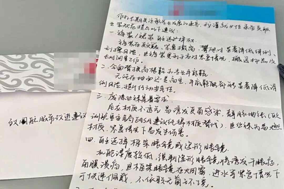 旅客邓女士7月24日在乘坐飞机时,找乘务员要了意见信和笔,写下了关于女性乘务员职业服装5点建议:裤装裙装自主选择权,全面替换高跟鞋和专业平底鞋,废除丝袜穿着要求,自主选择框架眼镜或隐形眼镜,取消强制化妆规定。邓女士将自己手写的建议拍照发到了网上,引起了很多网友的讨论。