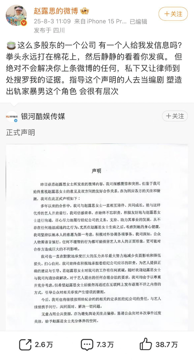 8月3日,@银河酷娱传媒 发布声明回应赵露思控诉,声明称多年以来的合作中,从不存在任何违法或违约之行为,并表示若赵露思女士对公司的工作有任何质疑,随时欢迎赵露思女士与公司沟通协商解决。