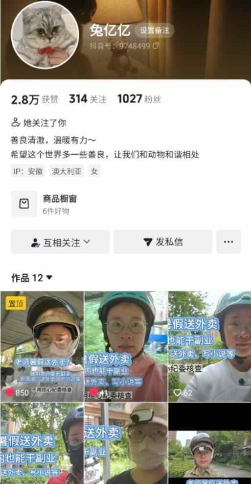 截至8月1日下午5点,曹老师的社交平台账号粉丝数1027人,获赞2.8万。账号里可以看到最早的三条视频发布于2019年,内容关于她救助流浪动物,其中一条点赞1.4万。“这几天送外卖涨了300多个粉丝。”曹老师笑着说,她对目前视频的播放、点赞和涨粉的情况还比较满意。