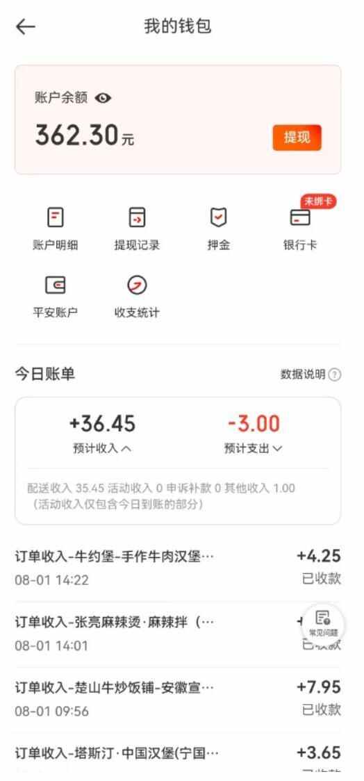 “送外卖有时候就像玩游戏做任务,看到有新的单子就想接,每次完成一单,收入马上就到账,虽然只有几块钱,但也会很高兴。”曹老师告诉记者,从7月23日到8月1日,10天时间她共完成了75单,收入362.3元。暑假还有一个月时间,她想坚持下去,开学之后可能就没有时间了。