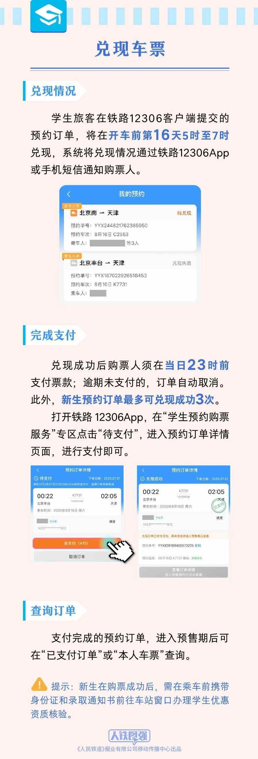 铁路12306客户端开设“学生预约购票服务”专区,即将入学的新生在铁路12306完成实名注册并填写学校所在地等学生优惠资质相关信息后,可于8月1日至9月5日在专区中勾选“新生入学”办理预约;在校学生在铁路12306完成实名注册、通过身份信息核验,完成优惠资质核验且有剩余优惠乘车次数的,可直接在专区办理预约购票。