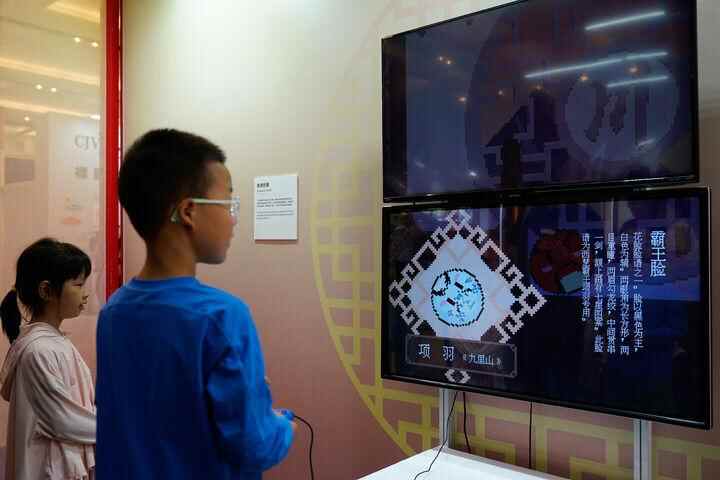 ↑2025年5月31日,在第九届中国成都国际非物质文化遗产节上,小朋友通过互动游戏了解川剧脸谱。