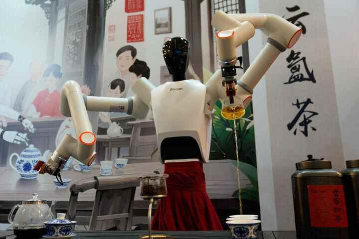 ↑2025年5月31日,在第九届中国成都国际非物质文化遗产节上,机器人茶艺师表演茶艺。
