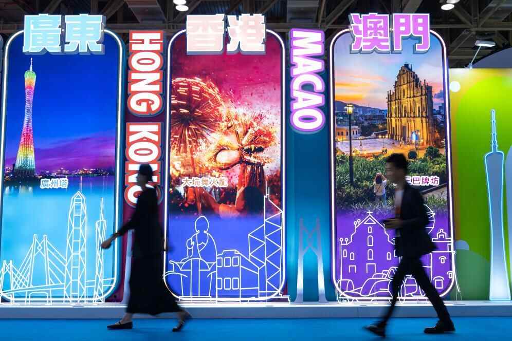 4月25日,参观者从第十三届澳门国际旅游(产业)博览会大湾区展板前经过。新华社发(张金加摄)