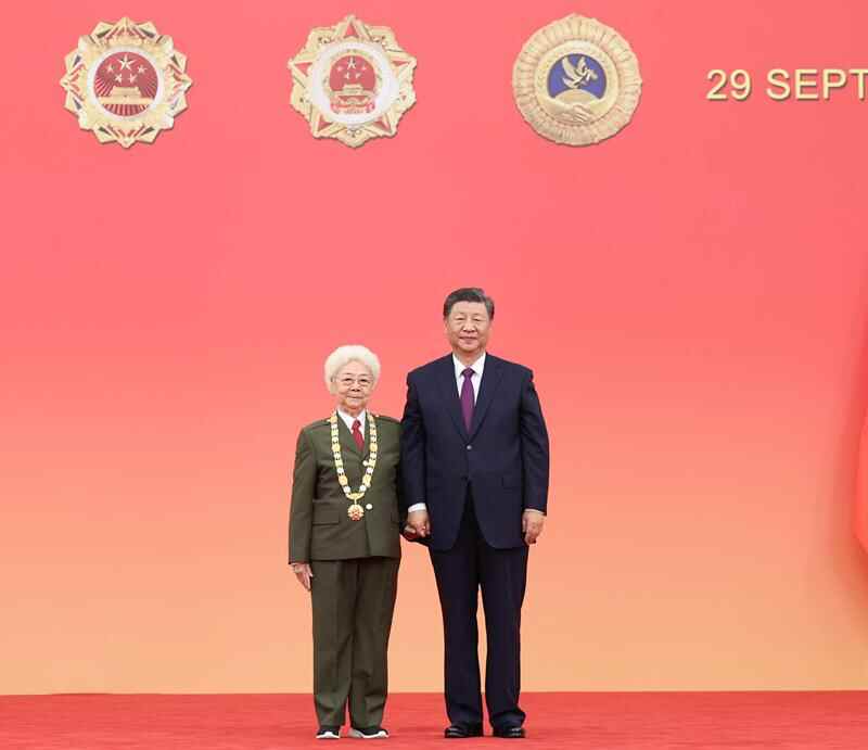 △2024年9月29日,中华人民共和国国家勋章和国家荣誉称号颁授仪式在北京人民大会堂金色大厅隆重举行。图为习近平总书记与“人民艺术家”国家荣誉称号获得者田华合影。