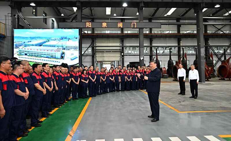 △7月7日,习近平总书记在阳泉阀门股份有限公司考察时,同企业员工亲切交流。