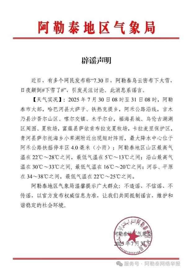 近日,有网民在社交平台发布“7月30日,阿勒泰乌云密布,下大雪,日夜颠倒”“你们热嘛,反正我不热,阿勒泰已经开始下雪了”等内容,引发网友关注和讨论。