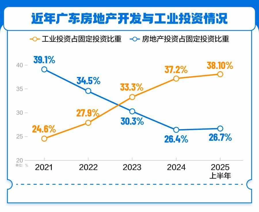 广东正是这样做的。2021年,广东省房地产开发投资1.75万亿元,此后逐年快速回落,至2024年回落至1.12万亿元,今年上半年同比继续下降16.3%。房地产开发投资在投资总量中的占比已经从高峰期的40.9%回落至27%;工业投资则持续增长,占固定资产比重逐步提升。2024年,广东工业投资突破1.5万亿元,占固定资产投资比重达到37.2%、创18年来新高,成为全省投资的“主力军”。