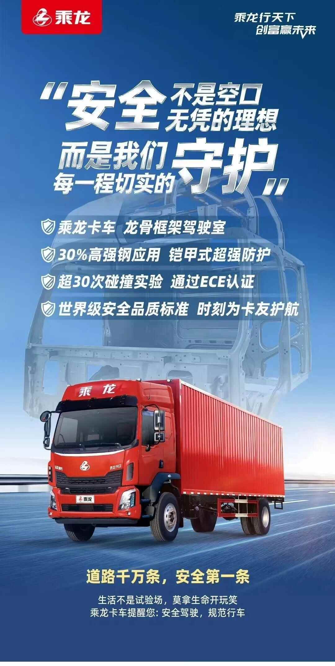 8月1日上午,乘龙卡车发布一张海报,海报上写着“安全不是空口无凭的理想,而是我们每一程切实的守护”。