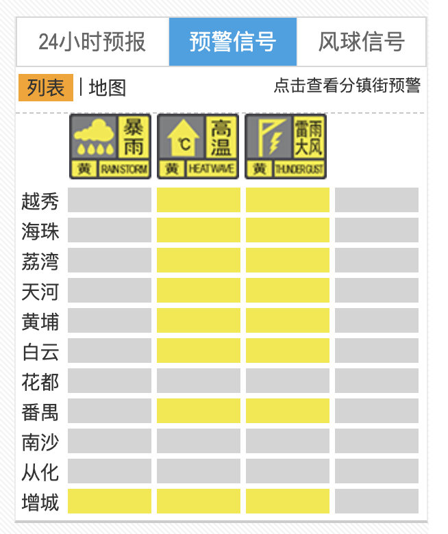 截至8月2日11时43分,广州多区同时发布暴雨和雷雨大风及高温预警信号。除花都、南沙、从化外,广州其余各区均同时发布高温黄色预警信号和雷雨大风黄色预警信号,其中增城区同时发布暴雨黄色预警信号。目前广州正处于周末及暑期旅游旺季,有出行需求的市民和游客,请留意天气变化,防御雷雨天气。