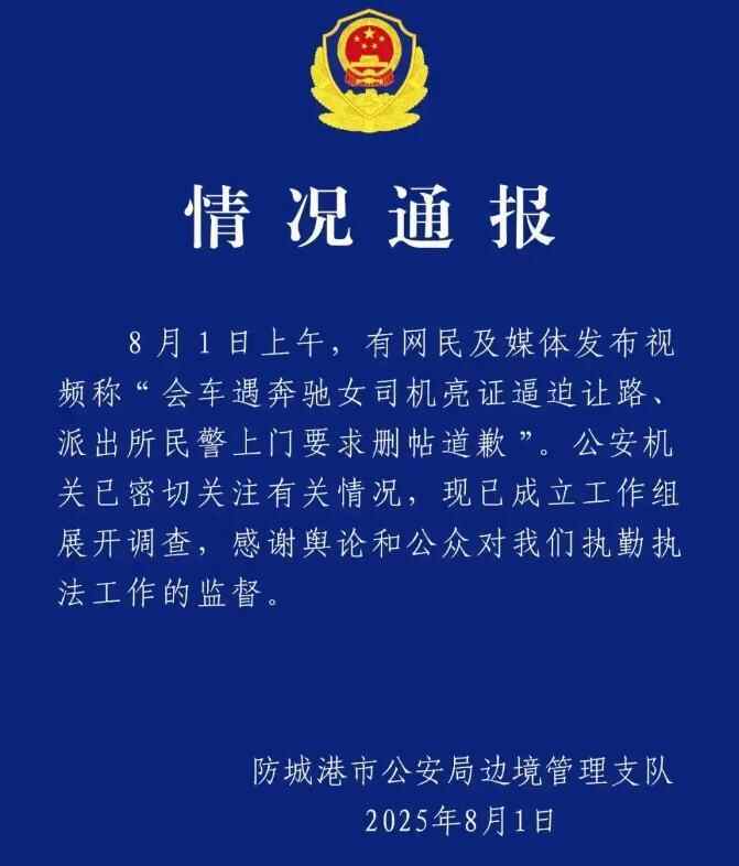 8月1日,防城港市公安局边境管理支队发布通报:“已成立工作组展开调查”,并感谢舆论和公众的监督。