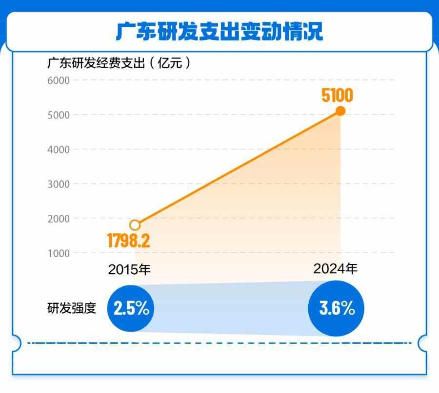 科技是第一生产力。面对新周期和新趋势,广东“重仓”科技创新激活发展动力,2024年全省研究与试验发展(R&D)经费支出约5100亿元,是2015年的2.8倍;研发投入强度为3.6%左右,已经超过日本、德国等制造强国的水平。