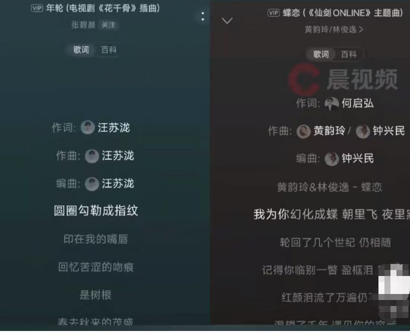 公开资料显示,《蝶恋》为网络游戏《仙剑Online》主题曲,由黄韵玲作词,黄韵玲、钟兴民作曲,钟兴民编曲,黄韵玲、林俊逸演唱,2009年5月发行。《年轮》为电视剧《花千骨》插曲,由汪苏泷填词、作曲、编曲,2015年6月,张碧晨、汪苏泷演唱版本先后上线。
