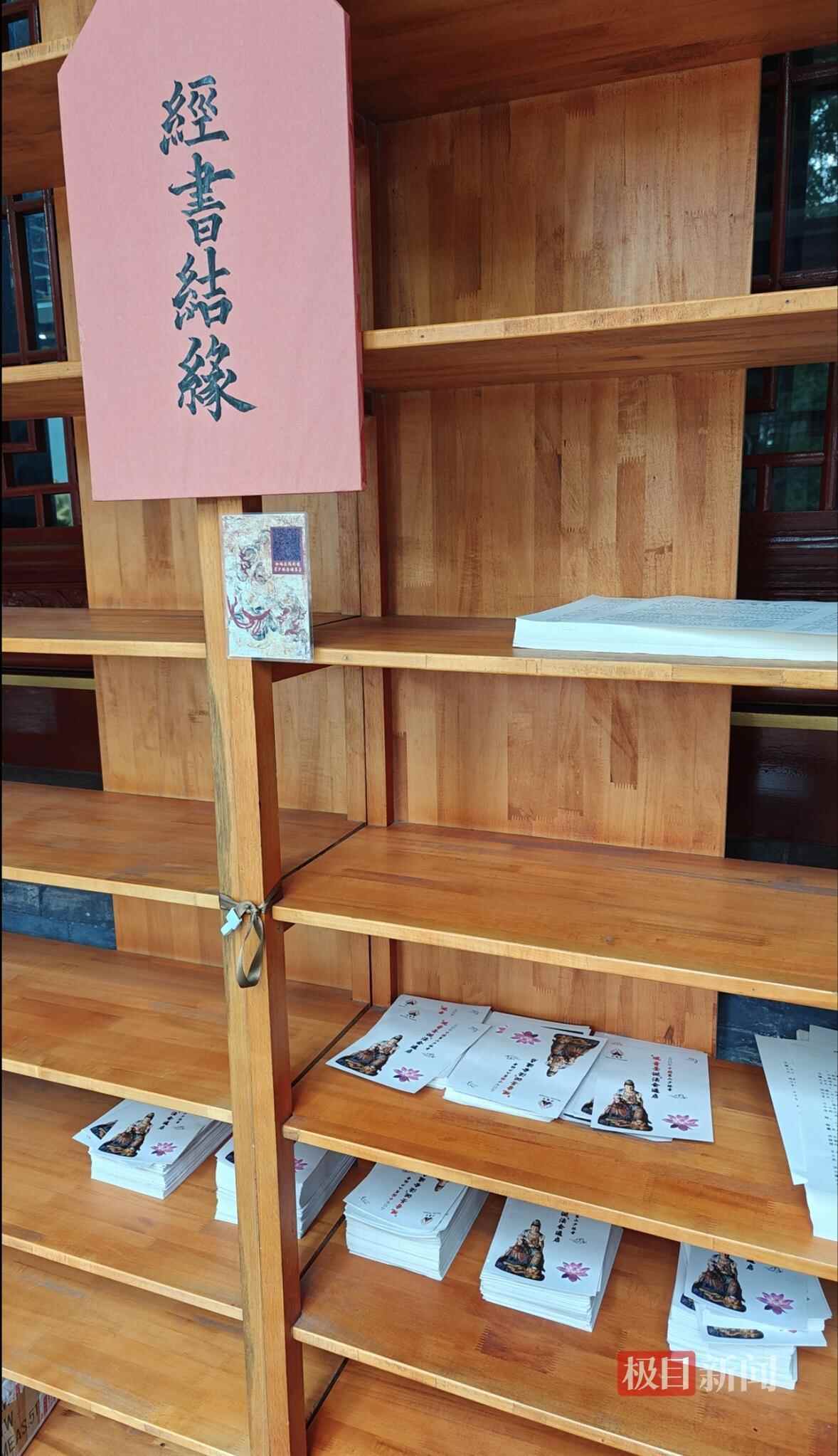 在两侧的图书阅览架上,摆放着一些免费借阅的经文,整个寺院对外开放区域,僧人并不多,并没有此前报道提到的随手扫码便可布施的“武僧”。印有“禅宗祖庭,功夫圣地”的屏幕因断电未显示任何内容,武术馆的功夫表演也是免费观看,整个游览过程几乎看不到任何收费项目。