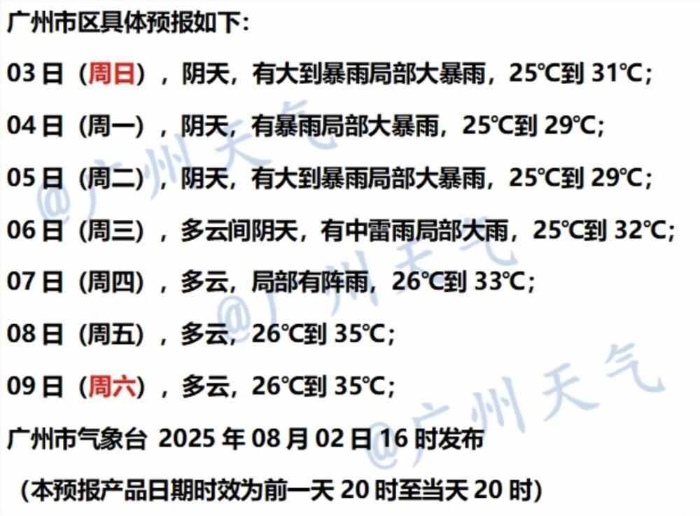 广州市气象台8月2日预计,未来几天广州雷雨天气频繁,雷雨时局地伴有7~8级短时大风,其中3日至5日,广州有大雨到暴雨局部大暴雨的降水过程。展望6日起副高增强,雨势减弱,广州雷阵雨转多云,高温趋于明显。