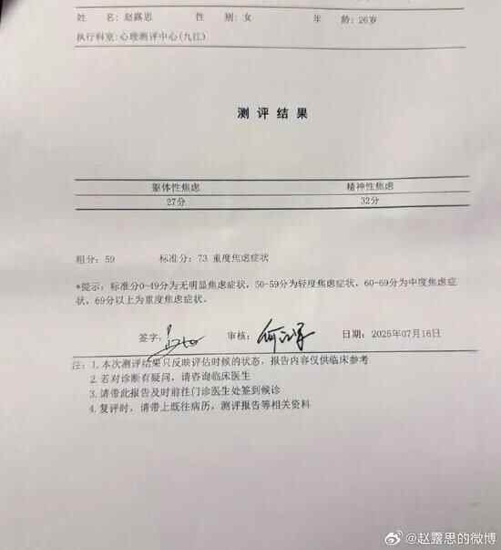 当日晚,赵露思发文谈解约风波,并晒出重度焦虑和抑郁测评报告: