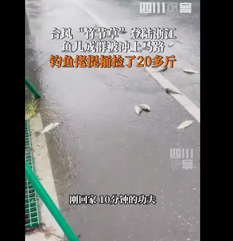台风“竹节草”过境,鱼群被冲上马路 钓鱼佬提桶捡20多斤鲫鱼