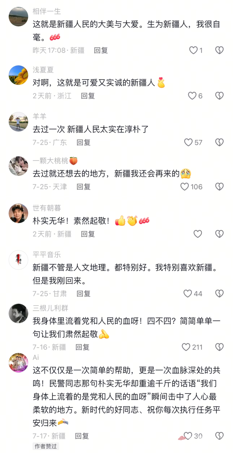 为了纪念这次特殊的经历,李女士将拍摄的视频发在了自己的个人社交平台上,她说希望能让更多的人看看真实的新疆。视频发布后,迅速引起了全国各地网友的关注。当日出警三名“95”后年轻辅警巴合达尔·铁留江、叶尔兰·吐勒甫别尔干和哈衣那尔·赛尔克江不仅收到了锦旗,还赢得了全国各地网友的点赞。辅警叶尔兰·吐勒甫别尔干说:“游客送来的锦旗和网友的点赞,这是对我们工作的支持和认可。今后,我们将继续做好本职工作,守护每一位群众的生命和财产安全。”