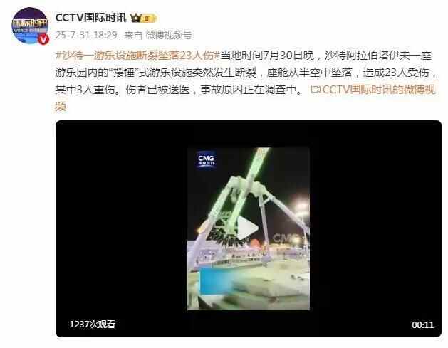 沙特:一座游乐场“大摆锤”在空中突然断裂 造成23人受伤,其中3人重伤