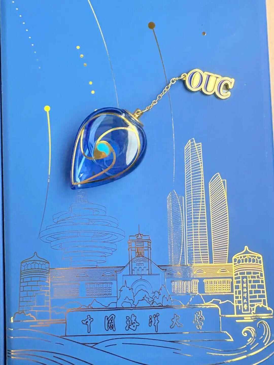多段开箱视频显示,中国海洋大学的录取通知书礼盒中不仅有录取通知书,还有茶包等物品,其中还有一枚缀有中国海洋大学英文缩写的水滴形吊坠,并配有一张介绍卡片。卡片上写道: