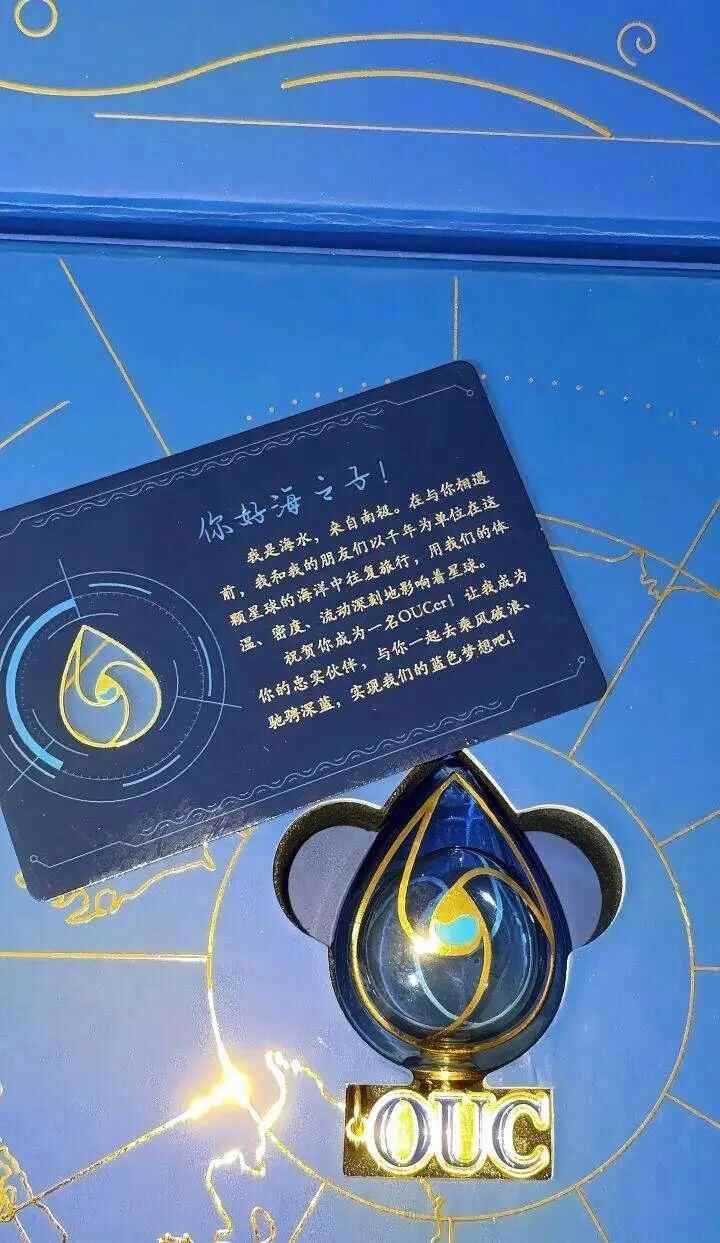 “我是海水,来自南极。在与你相遇前,我和我的朋友们以千年为单位在这颗星球的海洋中往复旅行,用我们的体温、密度、流动深刻地影响着星球。祝贺你成为一名OUCer,让我成为你的忠实伙伴,与你一起去乘风破浪、驰骋深蓝,实现我们的蓝色梦想吧。”