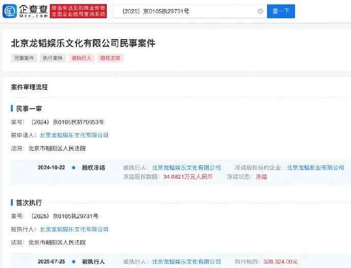 8月1日,据中新文娱消息,企查查APP显示,近日,北京龙韬娱乐文化有限公司新增一则被执行信息,执行标的32.83万元,执行法院为北京市朝阳区人民法院,此前该公司已因此案件被冻结超34万元股权,被冻结标的企业为北京龙韬影业有限公司。