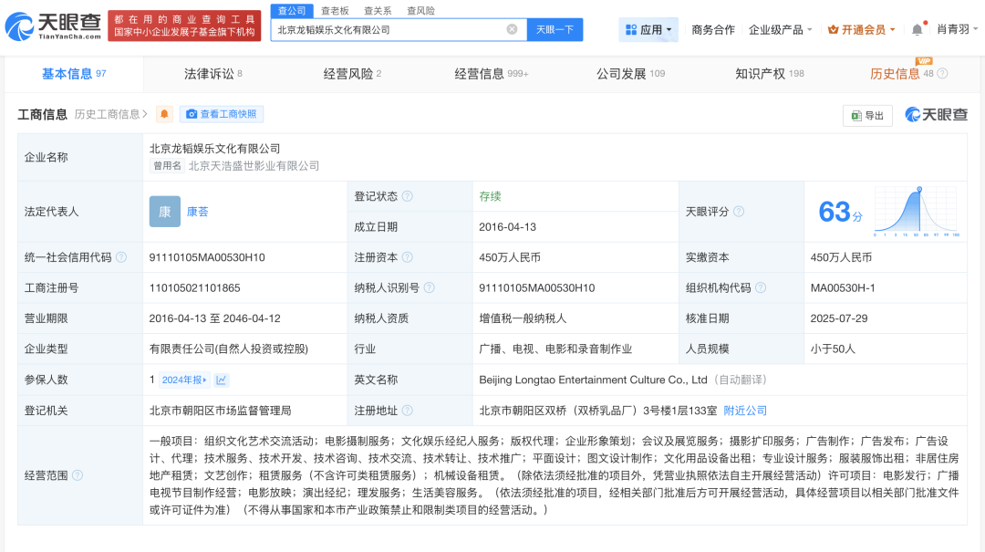 企查查信息显示,北京龙韬娱乐文化有限公司成立于2016年4月,法定代表人为康荟,注册资本450万元人民币,经营范围包含电影摄制服务、文化娱乐经纪人服务、演出经纪等。企查查股权穿透显示,该公司由黄子韬名下海南永恒星龙文化发展集团有限公司、张建华共同持股。